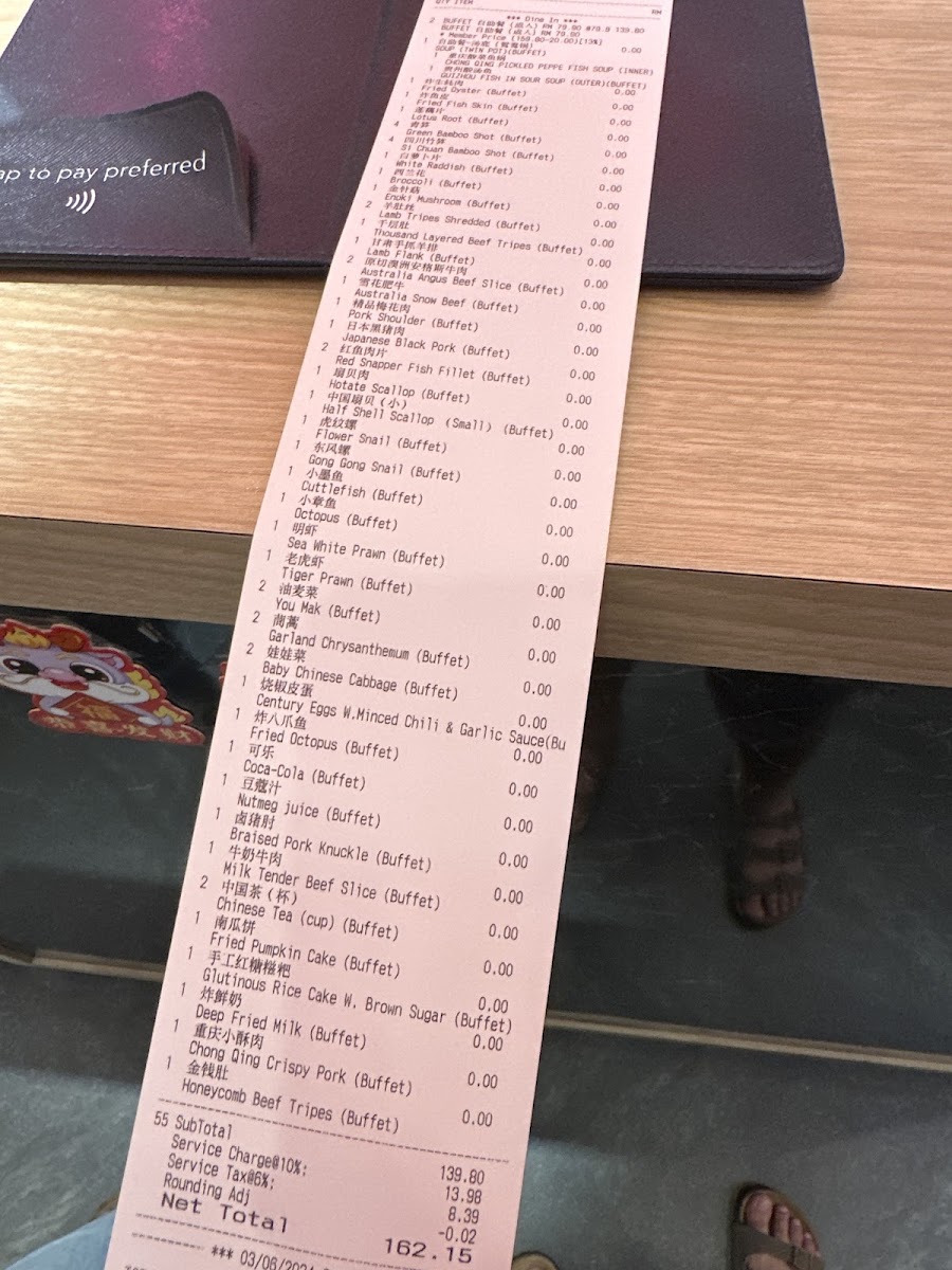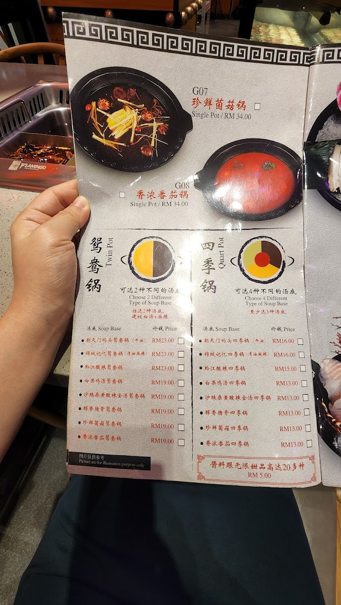 Alongside the main hotpot offerings, the menu includes a variety of unlimited sauces and desserts for a small additional cost, enhancing the overall experience without overwhelming the simplicity of the meal. These choices provide a comforting balance between familiar flavors and a touch of indulgence, fitting well with the restaurant’s warm and inviting atmosphere.